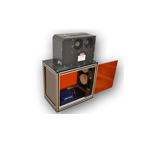 The Class I Portable Travel Enclosure is a very simple design that allows for quick and easy setup and teardown. The enclosure features laser safety glass on three sides so the part marking can be viewed from any angle. It also includes a simple sliding door to access the internal marking chamber. There is an external aiming diode for quick and easy focusing along with a lab jack and breadboard if desired. Also, there are vents in the side of the enclosure for fume extraction if needed.