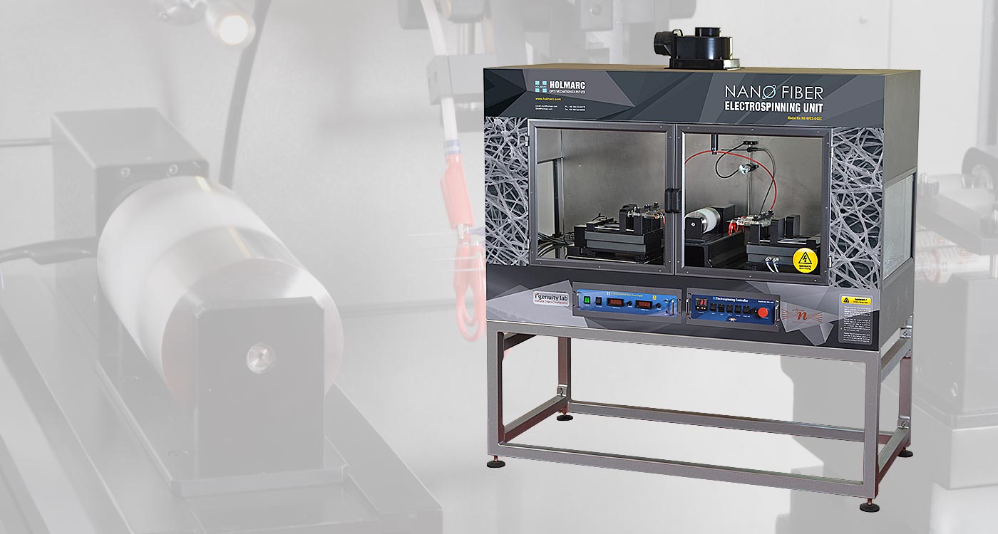 Holmarc’s (HO-NFES-043C model) Electro-spinning equipment features two syringe pumps on both sides of the rotating collector drum.